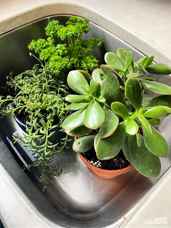 - Water until excess drains out the bottom. This helps settle the soil around the roots.