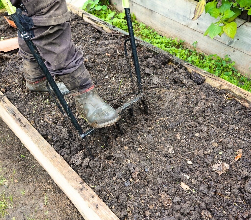 - Use a broadfork or garden fork to gently loosen compacted layers.
