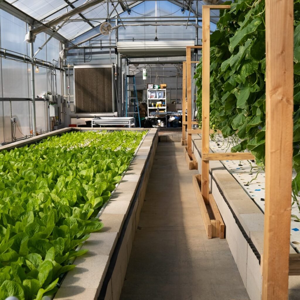 The greenhouse protects plants from harsh weather, allowing for continuous growing regardless of season.