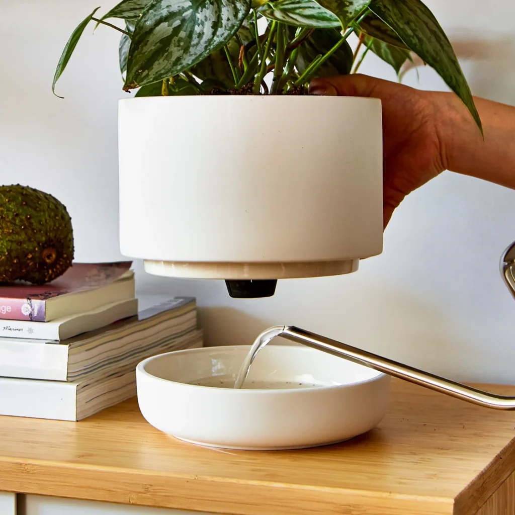 Fill a shallow tray with water and place the ceramic pot (with drainage holes) on it for 15–30 minutes. The soil will absorb moisture through the drainage hole, hydrating the plant evenly without wetting the foliage.